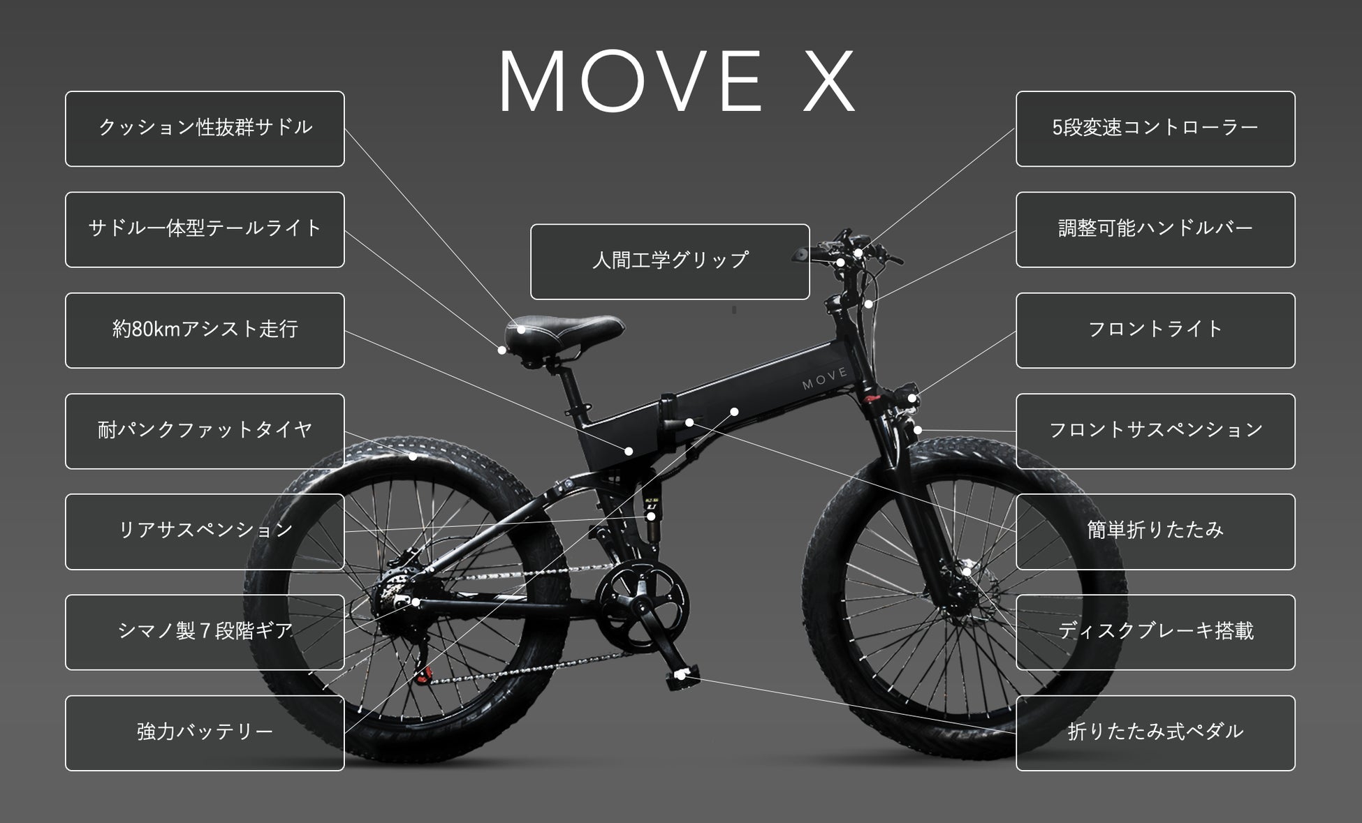 今回は、MOVE社の第一号プロダクトである次世代e-Bike「MOVE X」をMakuakeにて先行予約販売します。「友達に自慢できる電動自転車」というコンセプトでスタイリッシュかつパワフルなデザインのファットバイクを企画しました。